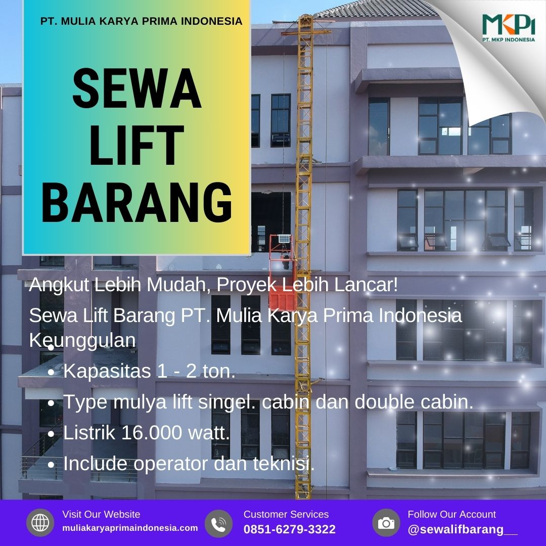 PT. MULIA KARYA PRIMA INDONESIA – Lift Barang / Alimak – merupakan sebuah alat mengangkut barang atau material. Lift Barang pada umumnya digunakan untuk mengangkut barang atau material proyek secara vertikal, dari lantai bawah ke lantai lainnya dengan sistem tombol switch dan dioperasikan oleh operator kami yang berkompeten.